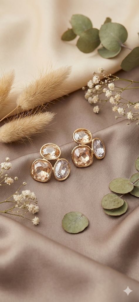 These luxurious earrings feature four delicately arranged crystals in warm champagne and clear tones, set in a sleek gold frame that catches the light with every movement.