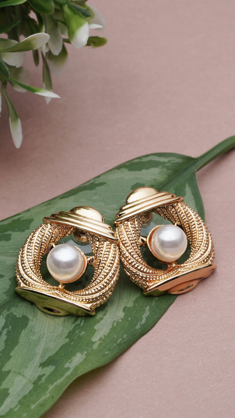 Timeless, opulent, and made to command admiration โ€” Regal Pearl Crest Earrings blend heritage charm with modern luxury. A luminous pearl sits like a crowned jewel at the centre, framed by an intricate golden crest that feels sculpted straight from a royal treasury. The detailing is rich, textured, and visually grand โ€” the kind of artistry you wear, not just own.
