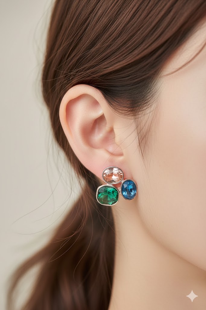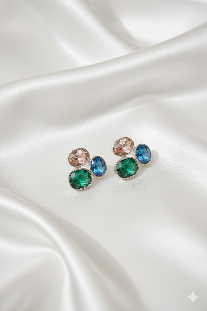 A radiant trio of colours, wrapped into one stunning statement piece. The Tri-Aura Gem Studs feature three luxuriously cut crystals โ champagne blush, emerald green, and ocean blue โ arranged in a modern clustered silhouette. Each stone catches the light from every angle, creating a soft, multidimensional glow that feels both elegant and effortlessly chic.